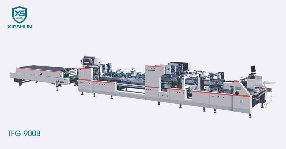 XIESHUN TFG-900B Crash-Lock-Hochgeschwindigkeits-Falt- und Klebemaschine, geeignet für geradlinige Boxen mit Crash-Lock-Boden. Sie können sicher sein, dass Sie in unserer Fabrik eine Hochgeschwindigkeits-Falt- und Klebemaschine kaufen.